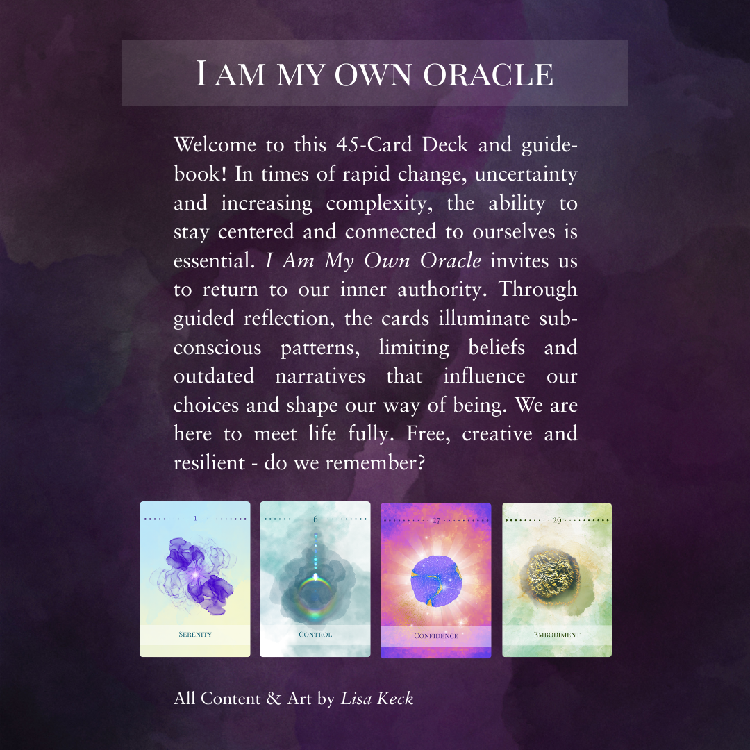 Das Kartenset “I Am My Own Oracle” lädt uns durch geführte Reflexion zu ehrlicher Selbstbegegnung ein: Wo denken und handeln wir (noch) in unbewussten Mustern, aus einschränkenden Glaubenssmustern heraus, oder kreisen in überholten Narrativen? Und wie können wir unsere innere Autorität stärken und leben, im ganz alltäglichen Sein? Was treibt uns im Unbewussten und wie können wir uns so mit unserer Essenz verbinden, dass sie ganz natürlich aus uns heraus strahlt? Letztlich sind wir hier, um das Leben in seiner ganzen Fülle zu erleben. Frei, kreativ und widerstandsfähig – und manchmal braucht es nur eine kleine Erinnerung daran.